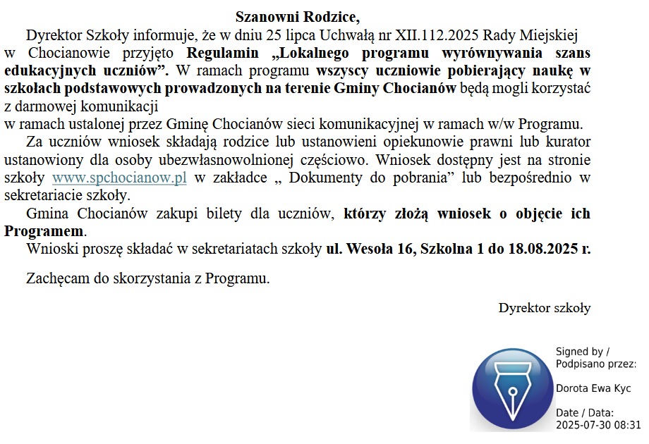 Informacja o organizacji Szkoły Podstawowej w Chocianowie