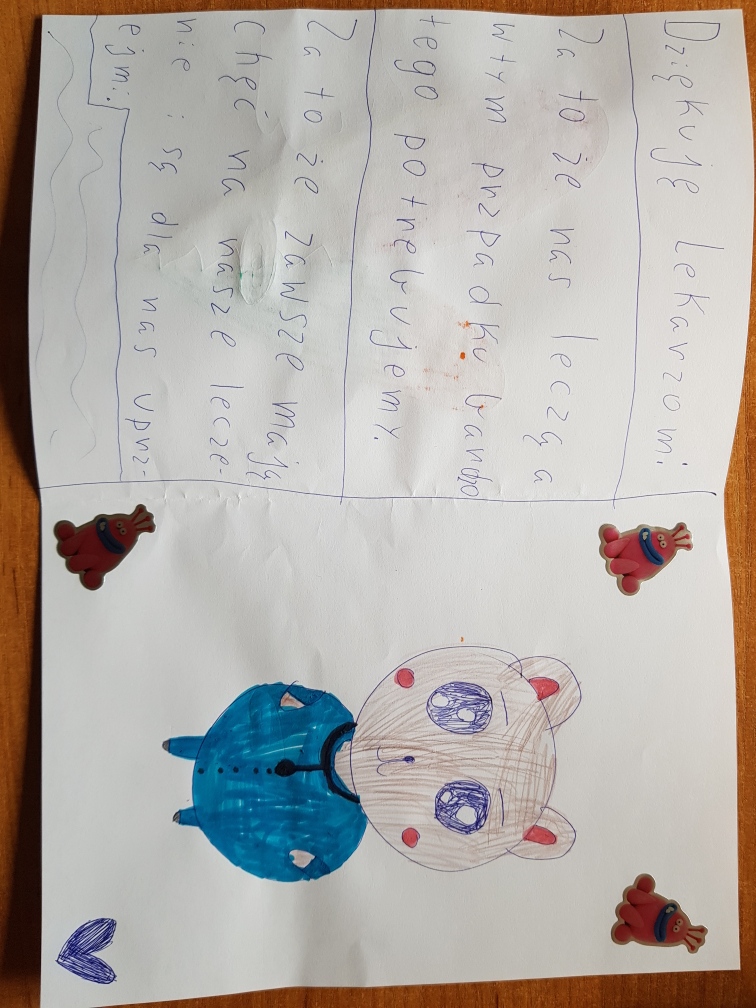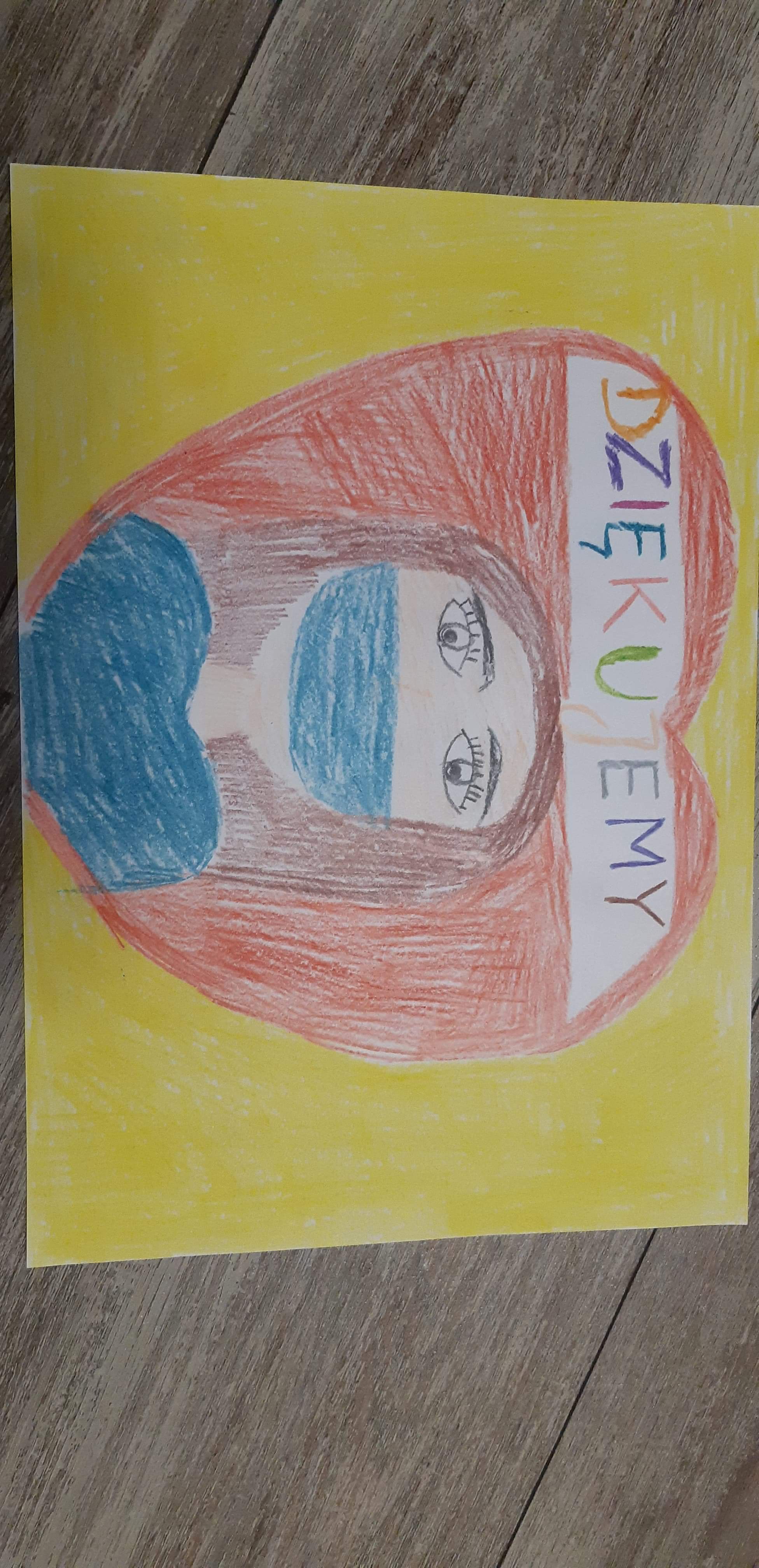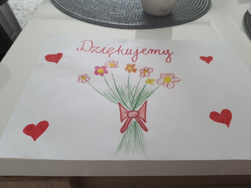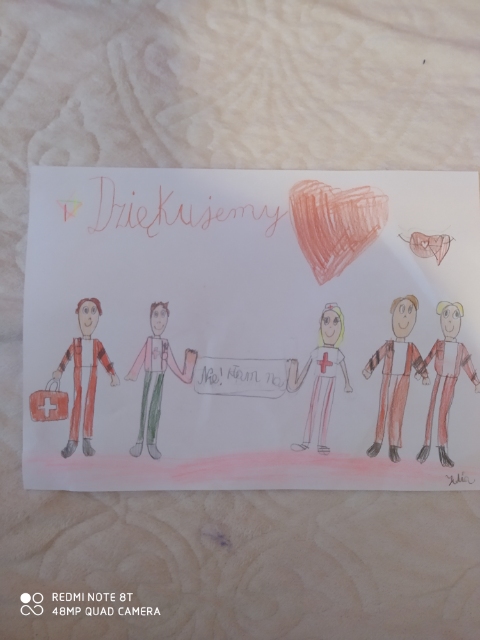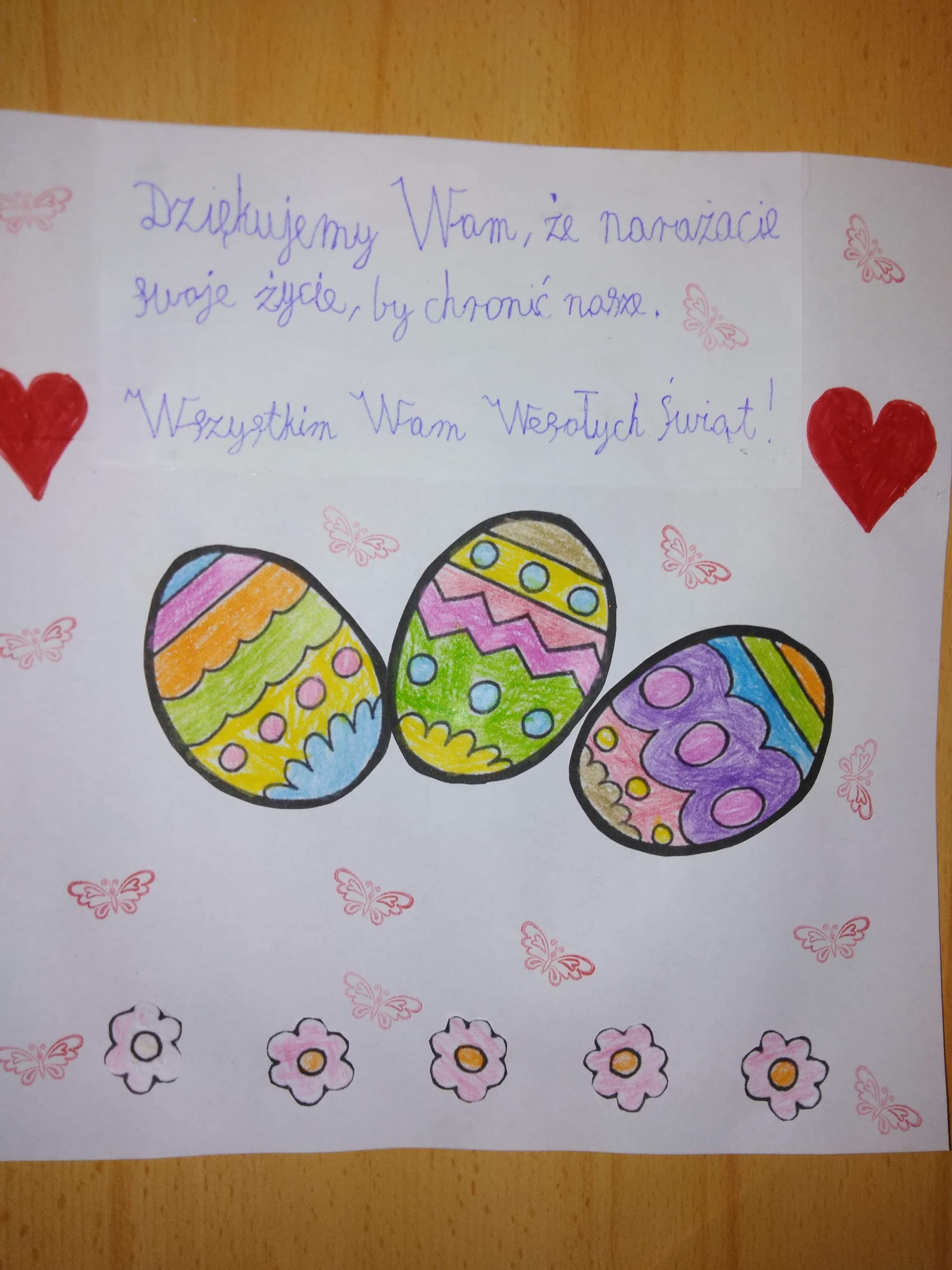 Nasi uczniowie wykonali kartki w podziękowaniu dla wszystkich lekarzy, pielęgniarek, osób pracujących w służbie zdrowia.